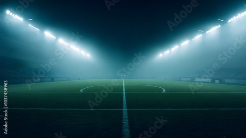 Empty football field under stadium lights at night, with dramatic atmosphere and mist, anticipation