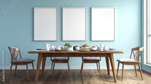 Empty frames above a wooden dining table setting.