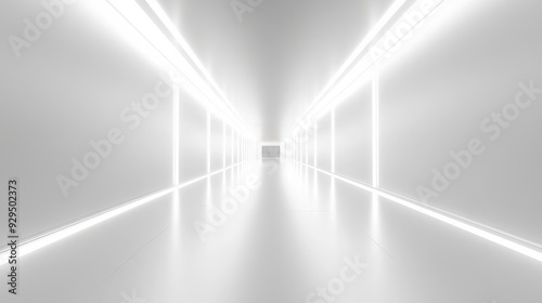 Empty futuristic 3D room with white background, abstract space technology tunnel, and modern neon lighting.