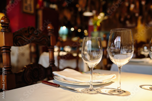 Empty glasses in a restaurant on white tablecloth. Shade, brown background and carved chairs.