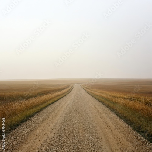 Empty gravel road through vast foggy fields, symbolizing solitude and open space