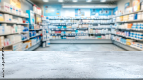 Empty gray stone countertop in front of blurred pharmacy shelves with medicines