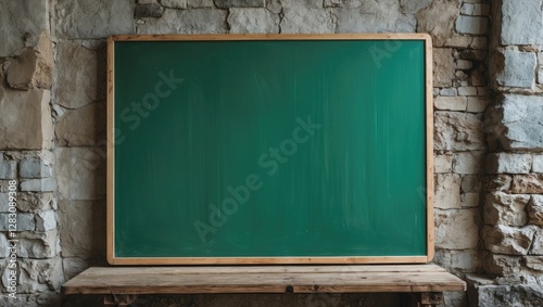 Empty green chalkboard on wooden table with rustic stone wall background in an old classroom or educational setting