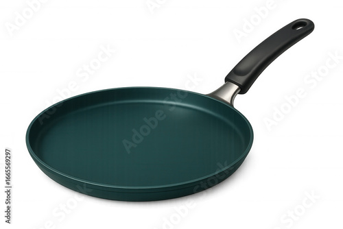 Empty green non-stick frying pan with metal handle, isolated on transparent background, ideal for cooking and kitchenware designs