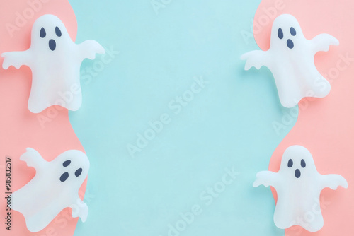 Empty Halloween picture frame on color background with bats, ghosts and pumpkin