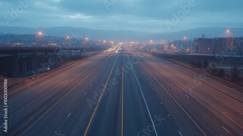 Empty Highway at Dusk with City Lights