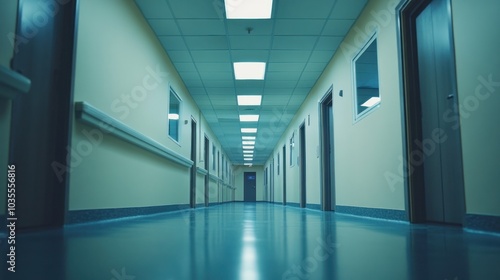 Empty hospital corridor and office layout, no people