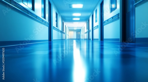 Empty Hospital Corridor, Blue Floor, Modern Clinic Design, Healthcare And Medicine Concept