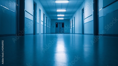 Empty hospital corridor illuminated by bright blue lights creating an eerie atmosphere : Generative AI