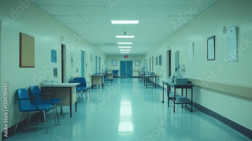 Empty hospital hallway, sterile environment, quiet corridor, medical facility