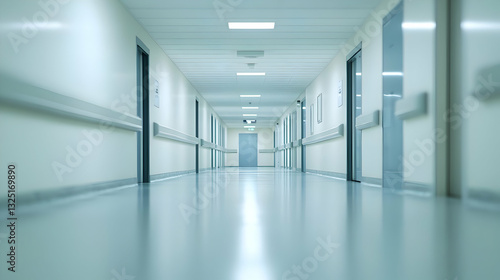 Empty Hospital Hallway With Bright Lighting And Green And Blue Tones Evoking Feelings Of Calm And Sterility