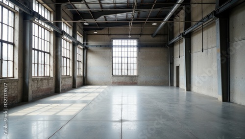 Empty Industrial Space with Steel Windows. Versatile Background. Ideal for product mockups in an industrial setting, illustrating concepts of spaciousness or urban decay