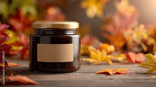 Empty jar label template surrounded by colorful fall leaves. Organic product feel