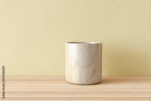 Empty light beige wooden cylindrical container on a light wood surface.
