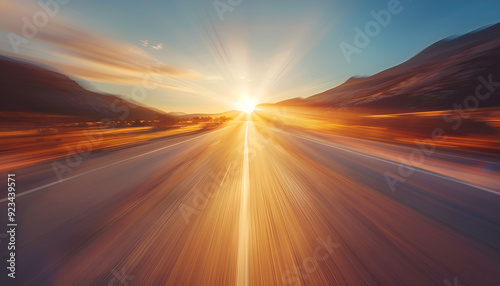 Empty long mountain road to the horizon on a sunny summer day at bright sunset - speed motion blur effect