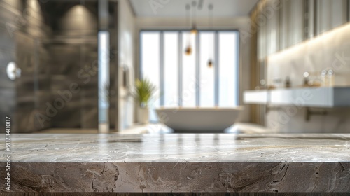 Empty marble top table with blurred bathroom interior Background. for product display montage