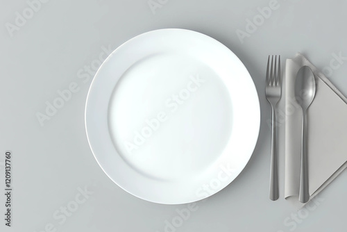 Empty menu, plate, cutlery and napkin on light grey table, top view. Mockup for design