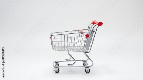 Empty metal shopping cart with red accents on a white background, ready for your products
