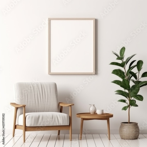Empty mock up poster frame on white wall. Interior design of modern living room with armchair