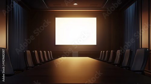 Empty modern boardroom with a long conference table ready for presentations and meetings