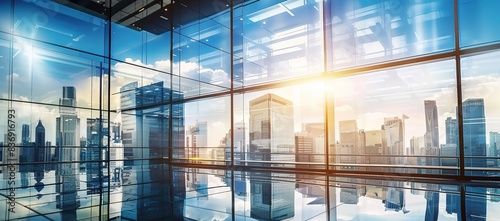 Empty modern business office skyscrapers. High-rise buildings in commercial district with blue sky and sunshine. Bright and modern high tech office background