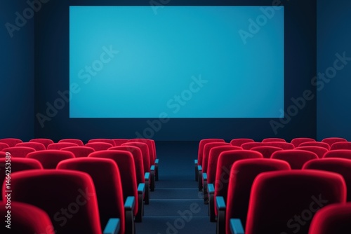 Empty modern cinema auditorium with red seats and illuminated blank screen