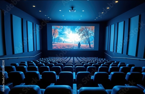 Empty modern cinema hall with comfy blue seats. Big screen shows beautiful autumn scenery. Futuristic tech design. Perfect for entertainment. Great for movie presentations. Ideal for customers