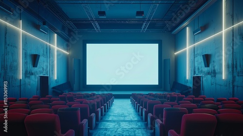 Empty Modern Movie Theater with Blank Screen and Blue Lighting