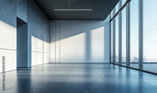 Empty modern office space with large windows offering a stunning cityscape view, illuminated by natural sunlight