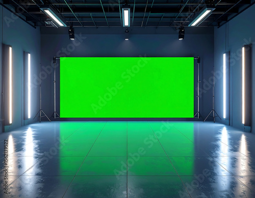 Empty modern studio with a large green screen backdrop.