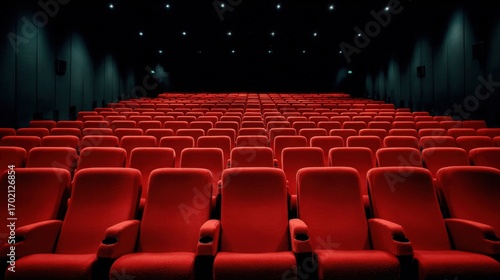 Empty Movie Theater Auditorium with Red Seats and Dark Interior, Ready for a Show