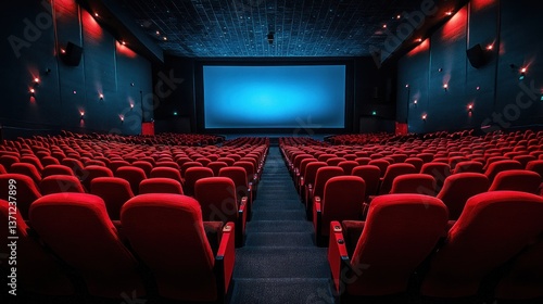 Empty Movie Theater: Rows of Red Seats Facing a Large Screen
