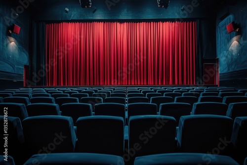 Empty movie theater with a red curtain awaits the audience, creating anticipation for the upcoming show.