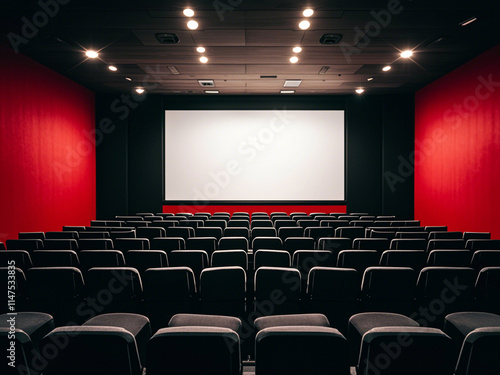 Empty movie theater with rows of black seats and a large projection screen