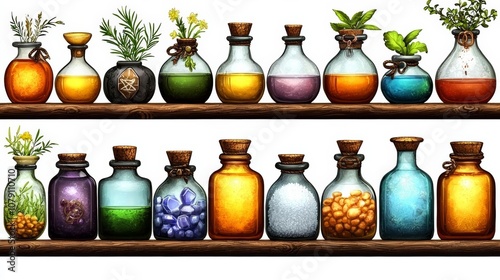 empty of Illustration of occult magic magazine and shelf with various potions, bottles, poisons, crystals, salt