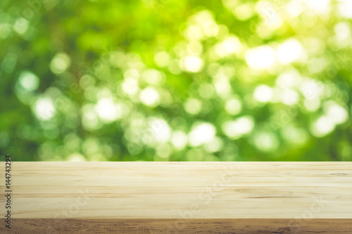 Empty of wood table top on blur of fresh green abstract from garden with sunlight .For montage product display or key visual layout