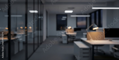 Empty office interior with neatly arranged desks and chairs, featuring glass walls in a blurred view, creating a spacious, modern, and professional workplace filled with natural light.
