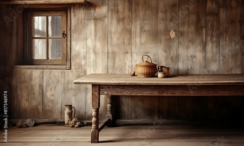Empty old wooden table with kitchen in background