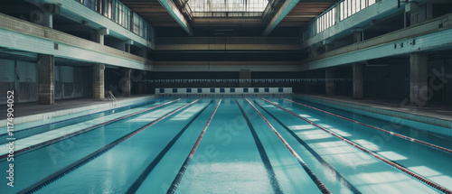 Empty Olympic-sized pool awaits competitors for upcoming races in a quiet sports facility