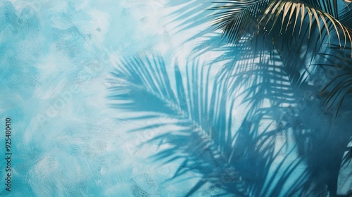Empty palm shadow blue color texture pattern cement wall background. Used for presentation business nature organic