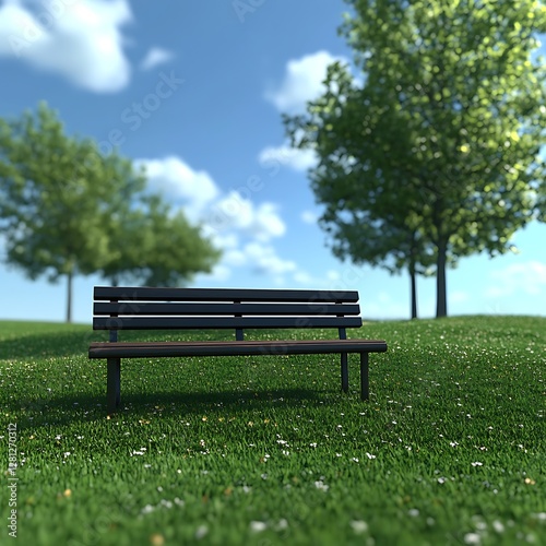 Empty park bench, sunny meadow, green trees, relaxing scene