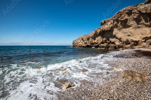 Empty pebble tropical beach under white cliffs against blue sky. Copy space