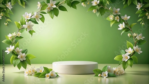 Empty podium with green background decorated with jasmine flowers and leaves, serene and peaceful atmosphere, jasmine flowers, botanical theme
