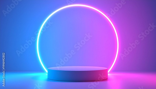 Empty podium with line gradient neon ring on background. illustration with podium on backgro