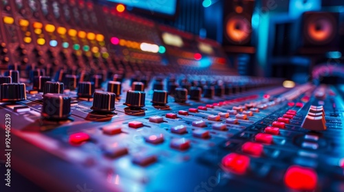 Empty professional studio used in music industry for producing tracks, mixing console and technical equipment in control room. Electronic panel board with sliders and buttons, daw software