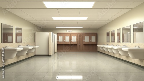 Empty Public Bathroom with Multiple Sinks and Mirrors