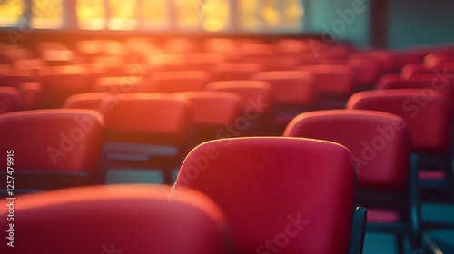 Empty red chairs in an auditorium, sunlit windows in background, perfect for conference or lecture concepts