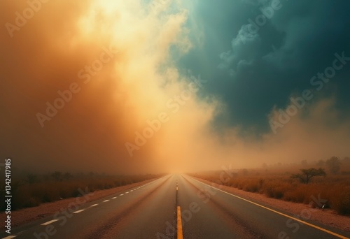 Empty Road Disappearing Into Thick Dust Clouds Stirred by Storm