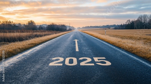 empty road written 2025 with arrow pointing towards. Highway to horizon represent succes, positivity and future of new year.