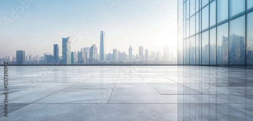 Empty rooftop plaza overlooking a hazy cityscape